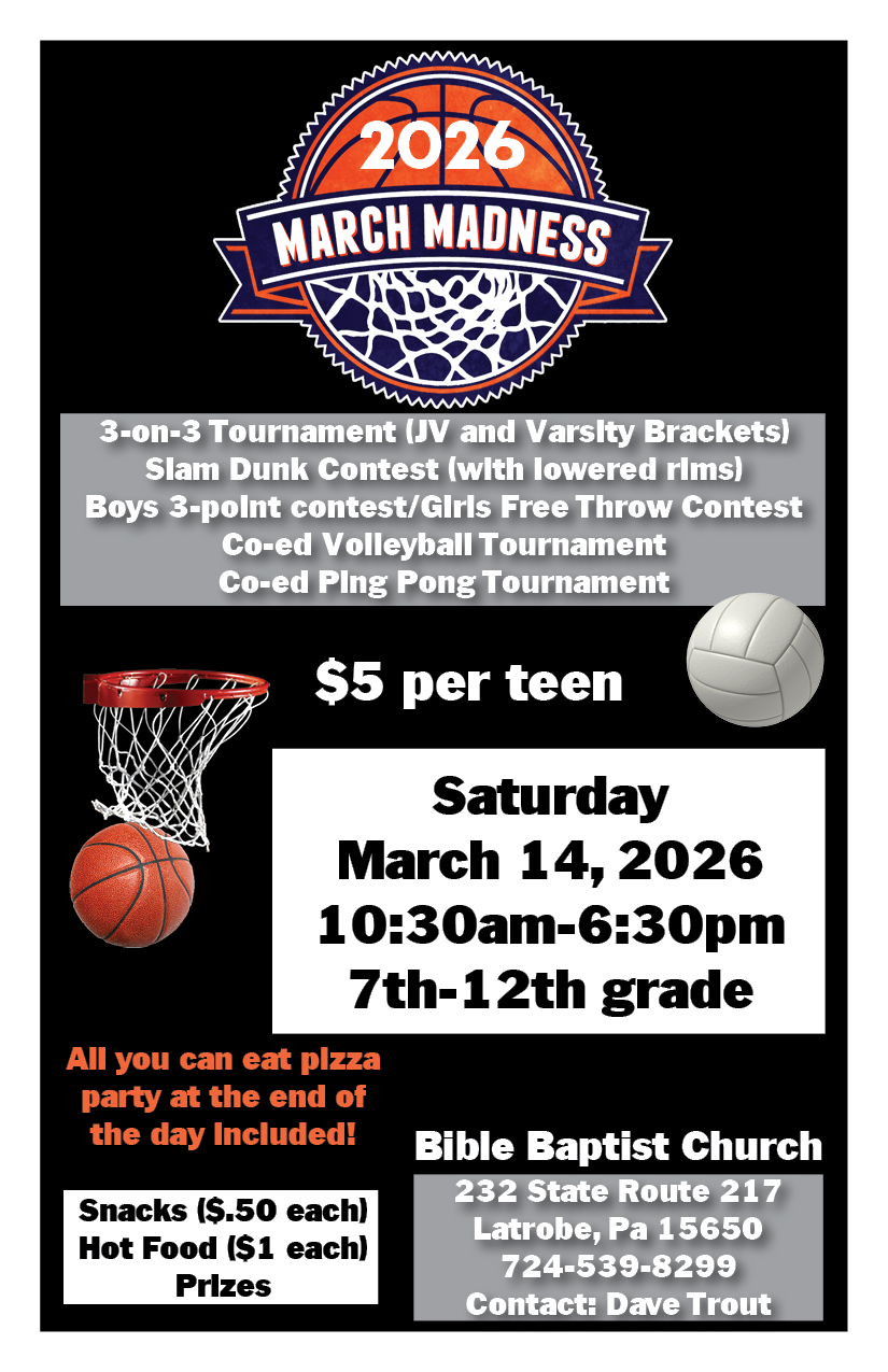 So what is March Madness? Well, from a teenagers point of view it’s crazy! Our main focus is to captivate teenagers through interesting preaching and many fun activities! Our main goal is to make sure that every young person knows Christ as their personal Savior. Not only do we have captivating preaching, but we have many events including 3-on-3 basketball, volleyball, ping-pong, three-point contests, and dunking contests. So come with your basketball shoes on and knee-pads up and get ready for March Madness! So come enjoy some wonderful preaching and fun activities.